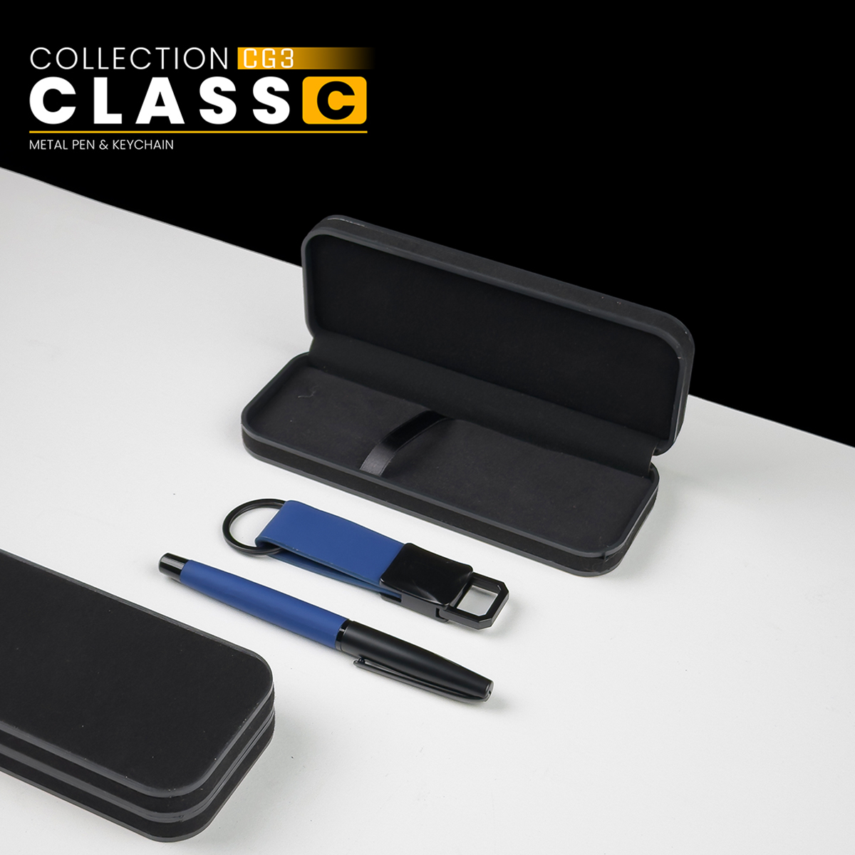 Pen: Two-Tone Metallic Executive Pen Keychain: Premium Executive Keychain Packaging: Rigid Gift Case with Soft Interior