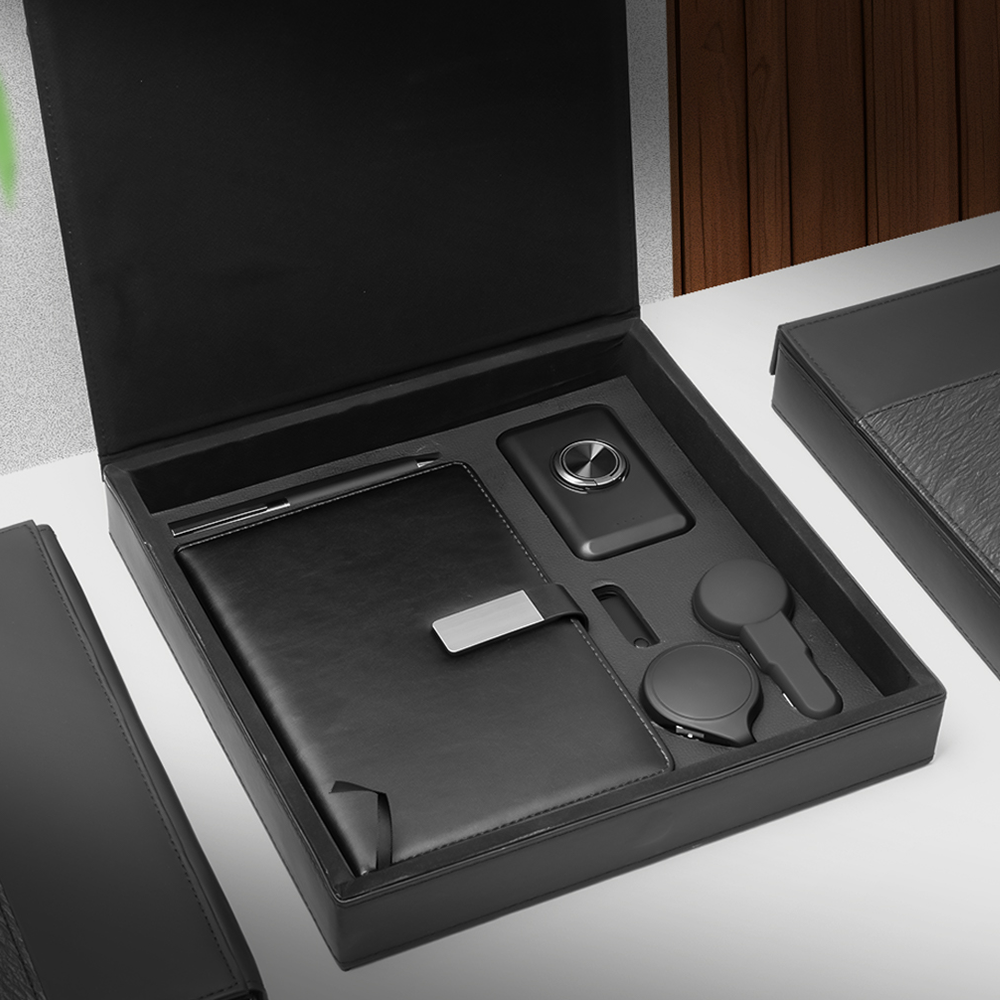 Notebook: A5 Premium Leather Notebook – 100 Cream-Colored Pages (80gsm) Pen: Sleek Metallic Executive Pen Flash Drive: 32GB Metallic Flash Drive Power Bank: 5,000mAh Wireless Fast-Charging Power Bank Charging Cable: Multi-Device Smartphone Charging Cable Card Holder: Premium Leather Card Holder with Illuminated Logo Packaging: Dual-Texture Magnetic Leather Gift Box with Foam Insert Box Dimensions: 27 × 27 × 4 cm